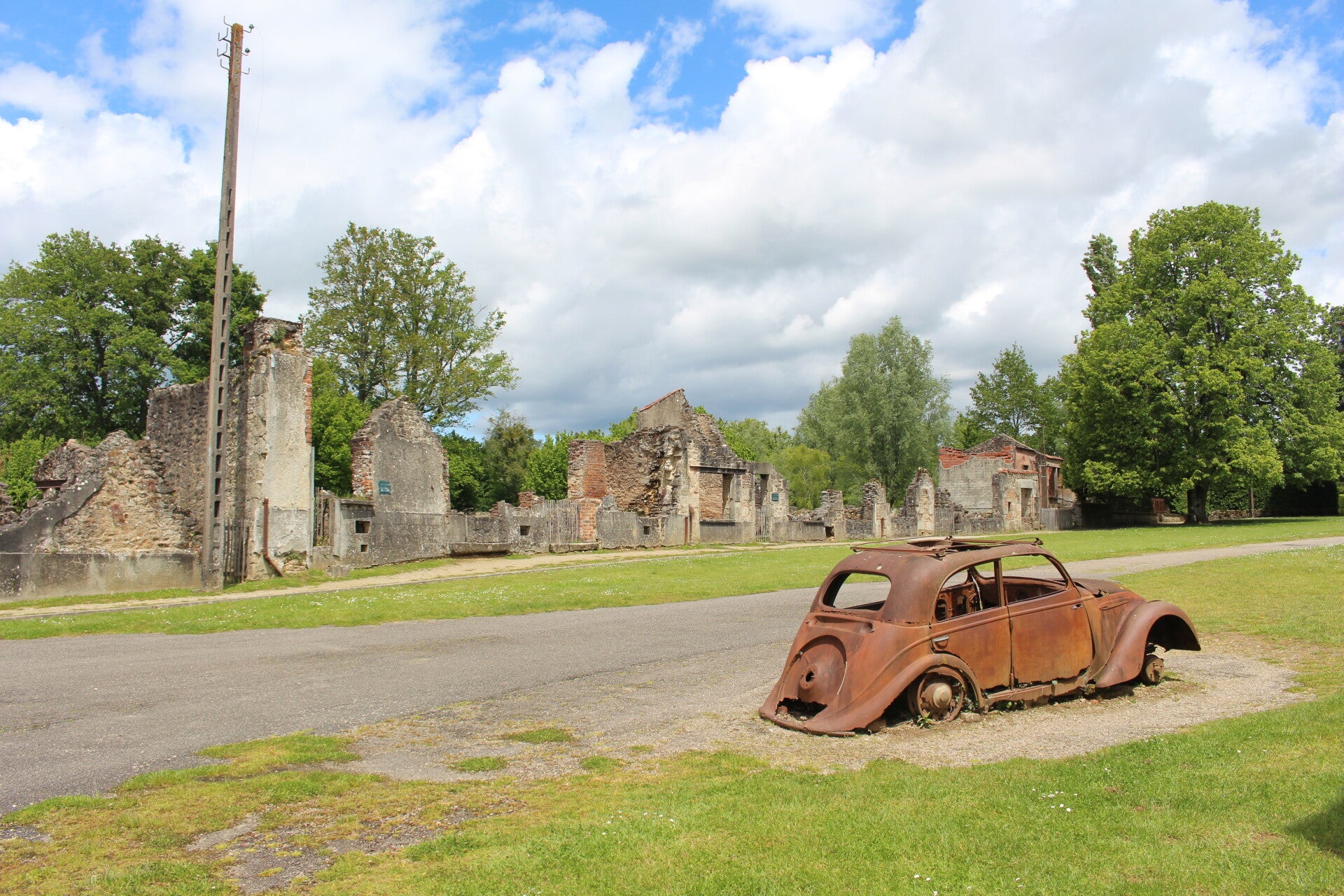 Le 10 juin 1944 une unité de la division SS massacra les habitants et incendia le village. Les ruines demeurent l'essentiel. Elles sont simplement dégagées de toute végétation parasite et discrètement étayées ; les pelouses sont tondues. Peu importe la foule ou les vacanciers, le visiteur sera pris par le silence, d'autant plus grand qu'il s'échappera de la rue principale. Au milieu des maisons : une machine à coudre rouillée, des carcasses d'automobiles, d'humbles souvenirs des métiers qui animaient un bourg ordinaire de la France de 1944. Les rails du tramway et les poteaux sont toujours en place. Pour préserver la mémoire du drame, le village martyr d'Oradour sur glane est conservé en l'état depuis 1944.